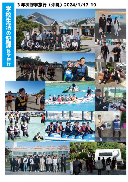 山梨県立甲府工業高等学校定時制 > 学校生活 > 学校行事 > 令和5年度 修学旅行(沖縄) 2024年1月25日カテゴリー: 学校行事 学校生活 令和5年度 修学旅行(沖縄) 令和6年1月17日(水)~19日(金)の日程で修学旅行が実施されました。 今年度の旅行先は沖縄です。 全日程で天気も良く、沖縄らしい陽気でマリンスポーツなどを中心に楽しむことができました。