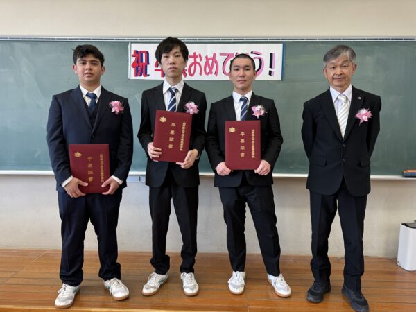 山梨県立甲府工業高等学校定時制 > 学校生活 > 学校行事 > 令和5年度 卒業証書授与式 2024年3月1日カテゴリー: 学校行事 学校生活 令和5年度 卒業証書授与式 令和6年3月1日(金)に卒業証書授与式を行いました。 朝は雨が降っていましたが、式が始まる前から晴れはじめ、春らしい陽気になりました。 今年度の4年次生は、コロナの休校で入学式から満足に学校生活が送れませんでした。 上級生になるにつれ、徐々に学校活動が再開していき、大きく成長する姿を見せてくれました。 本日は、本当に卒業おめでとうございます!社会人になっても頑張ってください! いつでも学校に遊びに来てください!