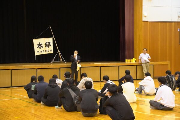 山梨県立甲府工業高等学校定時制 > 学校生活 > 学校行事 > 防災避難訓練(火災) 2024年5月7日カテゴリー: 学校行事 学校生活 防災避難訓練(火災) 令和6年5月1日(水)に本科・専攻科合同で防災避難訓練を実施しました。 今回は対火災を想定して訓練しました。 雨天だったので体育館への避難になりましたが、迅速に行動することができました。