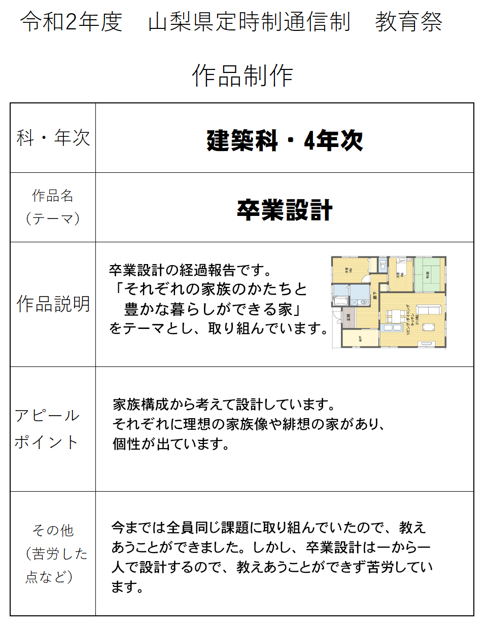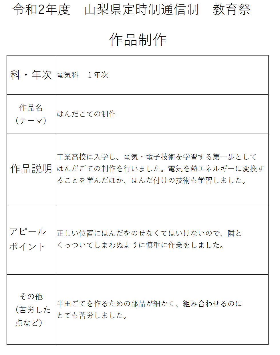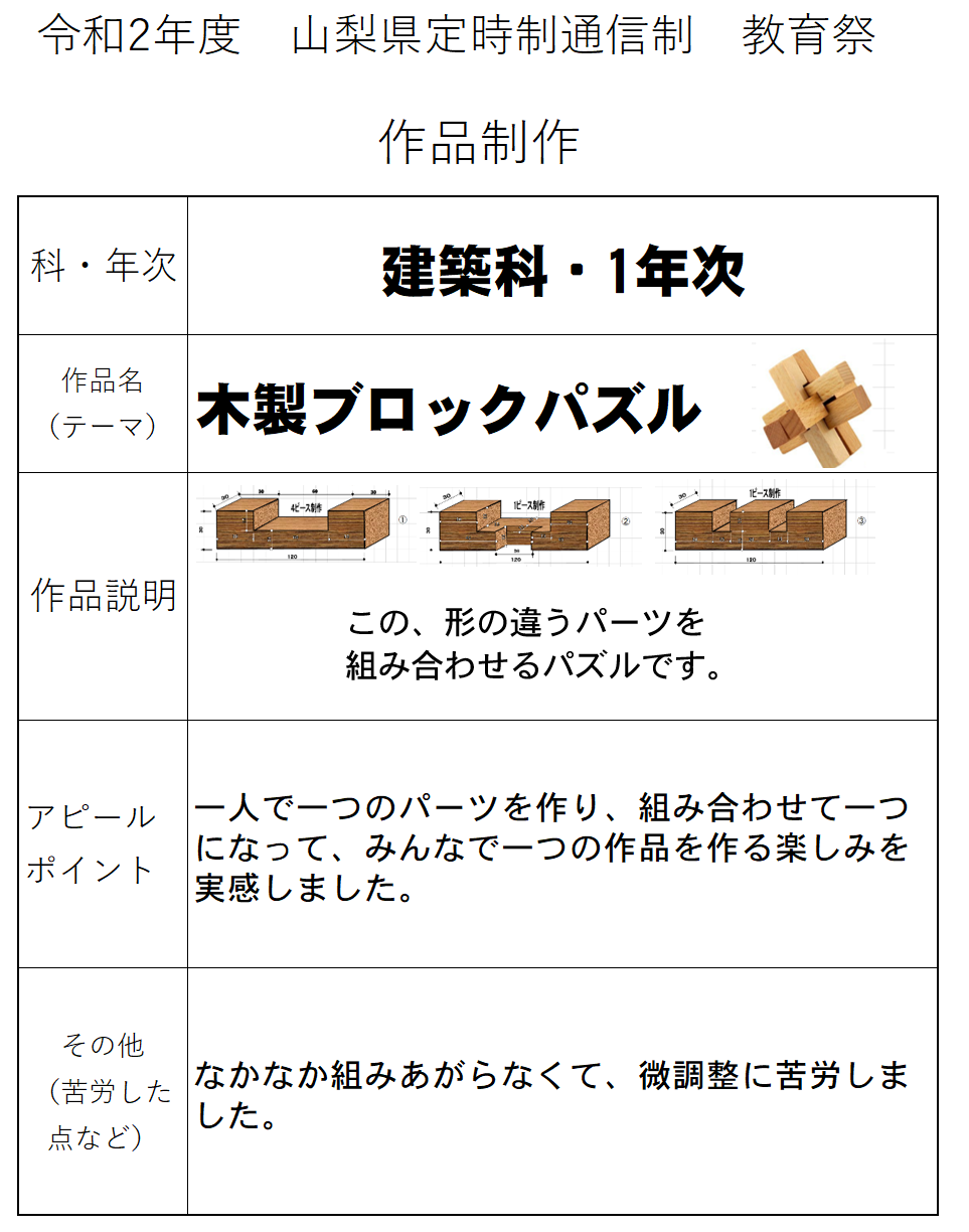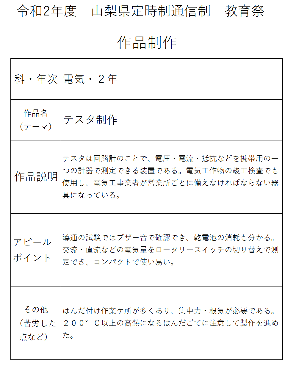 山梨県立甲府工業高等学校定時制 > 学校生活 > 各科情報 > 定通教育祭作品制作(その2) 2020年10月15日カテゴリー: 各科情報 学校生活 定通教育祭作品制作(その2) 入賞クラス以外の作品制作を紹介します。 <1年機械科> <2年機械科> <4年機械科> <1年電気科> <2年電気科> <3年電気科> <1年建築科> <2年建築科> <4年建築科>
