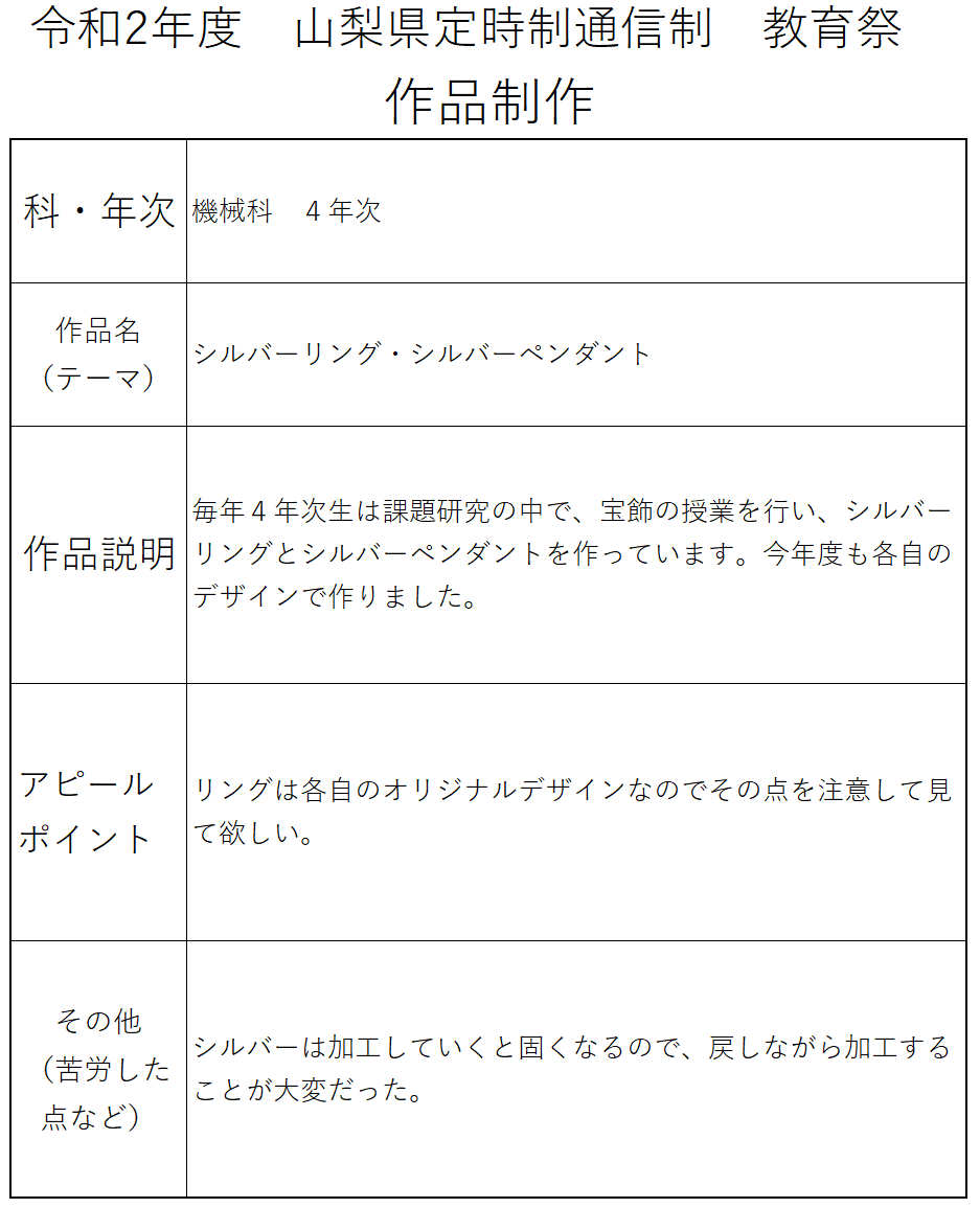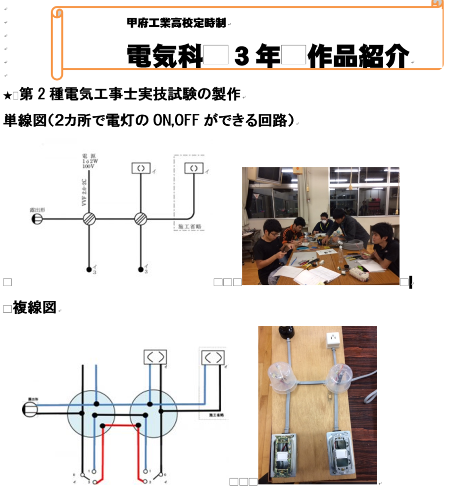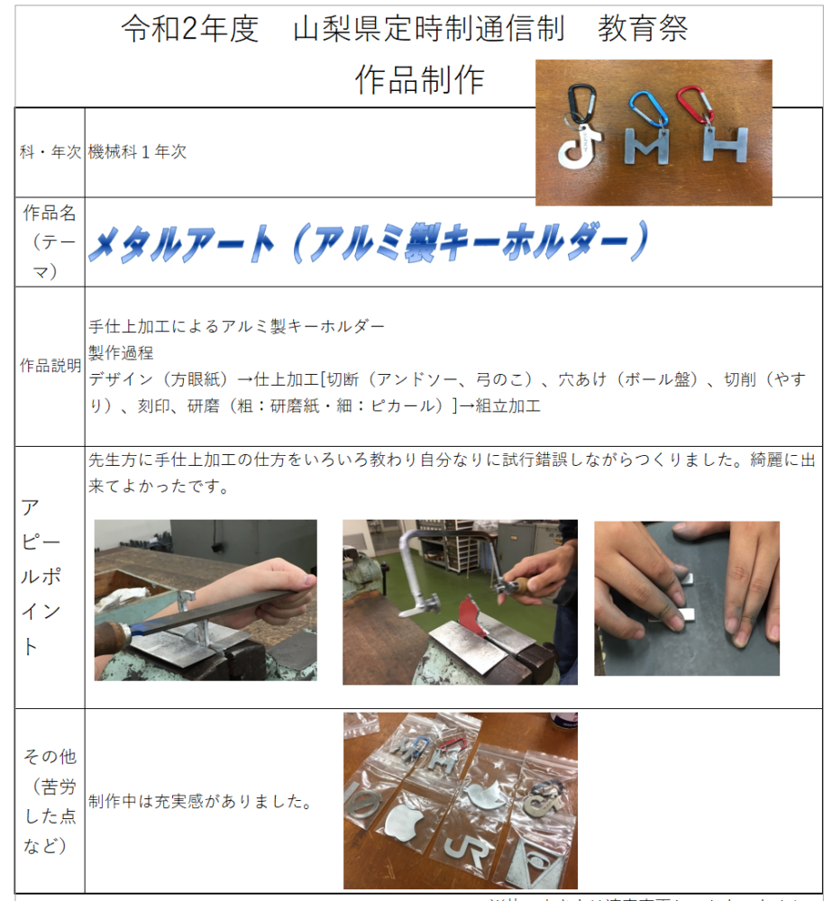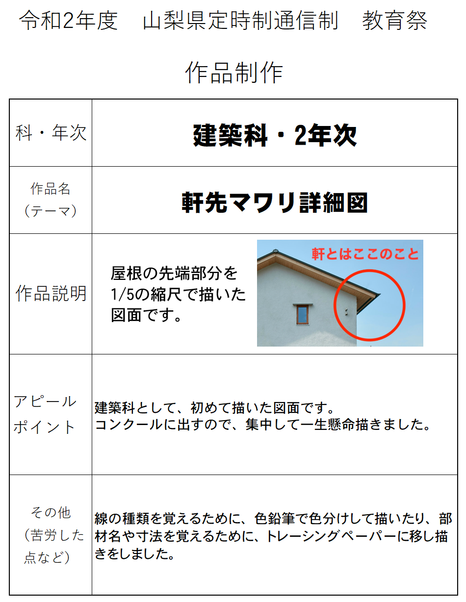 山梨県立甲府工業高等学校定時制 > 学校生活 > 各科情報 > 定通教育祭作品制作(その2) 2020年10月15日カテゴリー: 各科情報 学校生活 定通教育祭作品制作(その2) 入賞クラス以外の作品制作を紹介します。 <1年機械科> <2年機械科> <4年機械科> <1年電気科> <2年電気科> <3年電気科> <1年建築科> <2年建築科> <4年建築科>